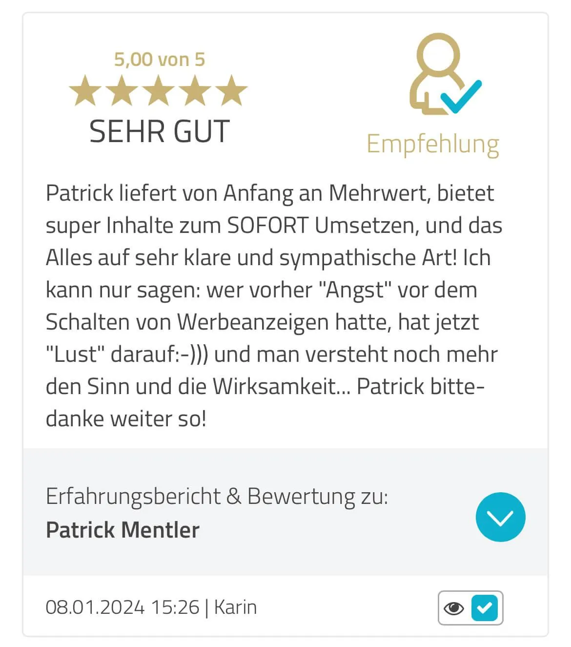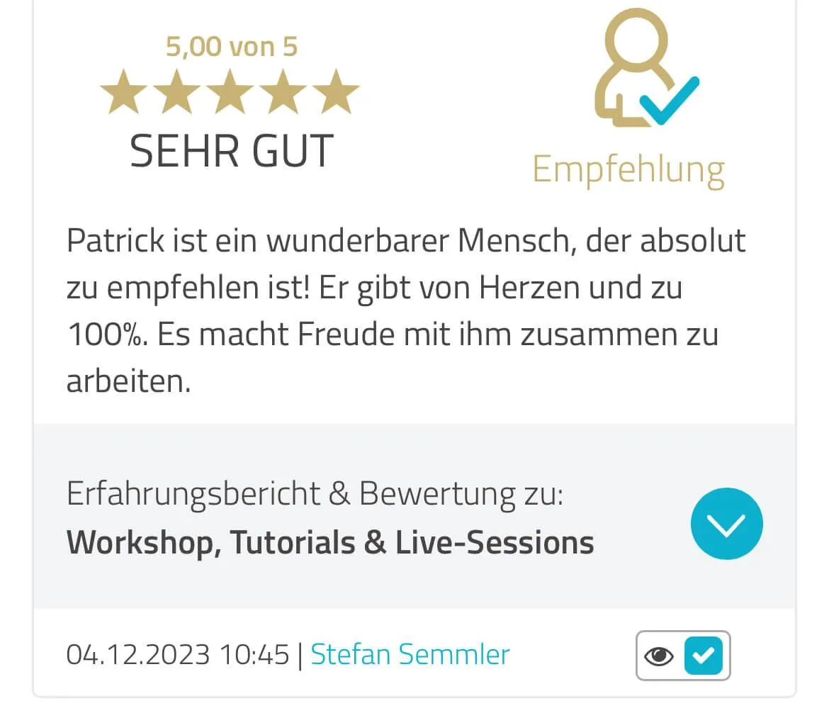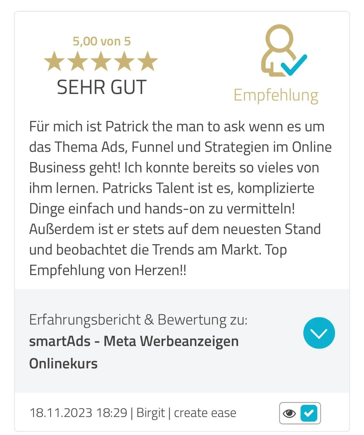 „Für mich ist Patrick the man to ask, wenn es um Ads, Funnel und Strategien im Online-Business geht. Er macht komplizierte Dinge einfach und hands-on – und ist immer am Puls der Zeit.“